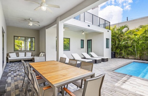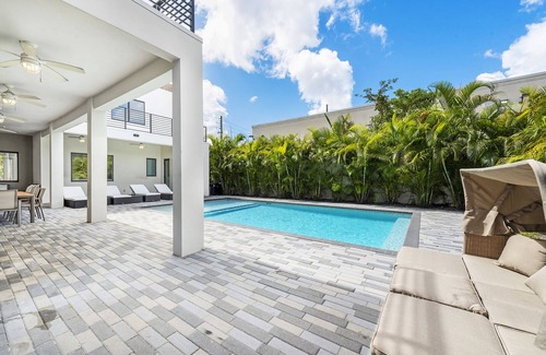 Beautiful new modern pool home with covered terrace and full outdoor pool bathroom.