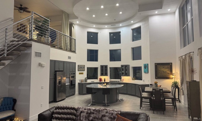 Modern Vegas Loft with Strip AND downtown Views | 2BR/2BA | High-End Everything. This space is a striking, open-concept home with dramatic architectural elements and stylish decor. There are 2 balconies to enjoy the breathtaking views from and a 30ft high stone fireplace to set the mood! The main bedroom is a private sanctuary with its own balcony , that feels like a spa retreat.
