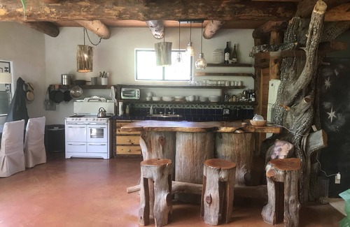Enter through a gated impasse, this special & unique home was built by a local artist around a 20 ft Rocky Mountain cedar log that supports the roof center. Massive rocks from the nearby creek, reclaimed logs, reclaimed colored glass, were used as part of the construction. Great room with kitchen, living room, dining room are built around a central koi pond enveloped by cacti and 20 ft tall tropical plants. A semi spiral cedar staircase leads to second floor sleeping mezzanine, with a master bedroom and 2 additional sleeping quarters off of the master bathroom.