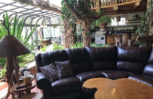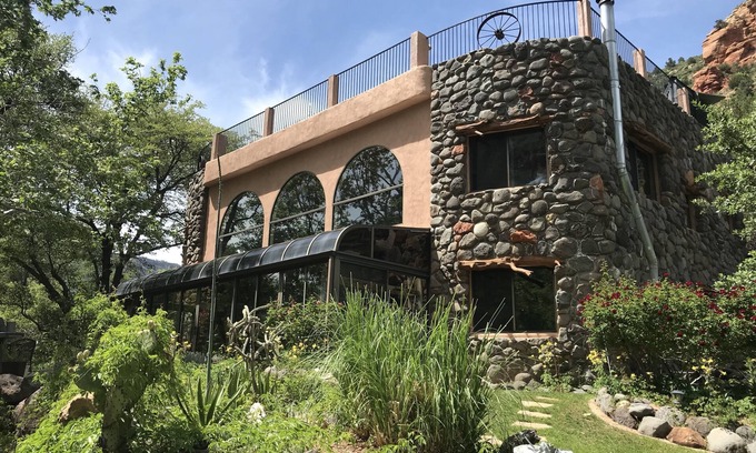 This home is an experience, artistic design, inside pond with koi, views out every window of the beautiful canyon. And a grass roof with stargazing, games, fire pit AND hot tub! Why stay in a single hotel room when you can have this entire home and property surrounded by mountains and red rock views!! Unwind and unplug in this hidden gem tucked away in beautiful Oak Creek Canyon. The last home at the very end of a historic road, hidden from even the locals! This home has even been boasted on the news.