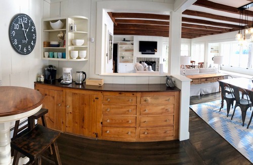 - Kitchen with butcher block island, coffee bar, bistro table and side buffet.