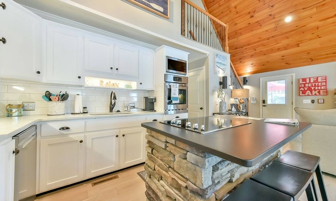 Guests enjoy plenty of space to have their meals. Cook something up in the kitchen or fire up the propane grill! There are three dining tables on the main floor, one in the eat-in area (6 people + 3 more at the island), a deckside picnic table (4 people), and a large table on the back deck overlooking the water (8 people). Our kitchen is stocked with basic dry goods & spices, dishes, silverware, pots & pans plus plenty of serving and bakeware to fit your needs. We also have a brand new booster seat for your little ones.