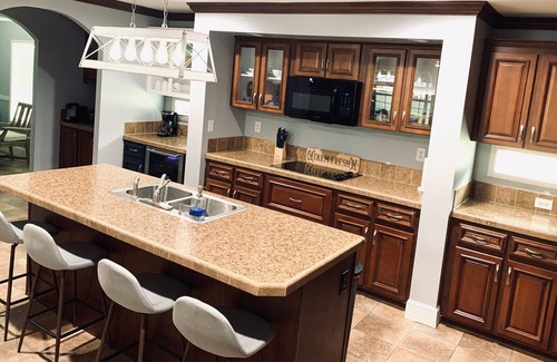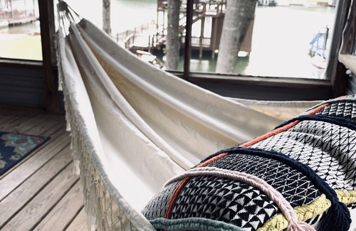 The 2 story boathouse is the perfect place to get in the lake and enjoy the water! The floating dock has 2 lounge chairs with cushions for sunbathing. There is also a choice of floats in the boat house along with fishing rods to keep you entertained. Another dining area is on the boat house that sits 6 people. Upstairs is one of the most unique features of the home with it's own "Pirate" themed bar with 3 rope swing seats. Enjoy a cold one up top and relax with your guests! We have a very special friend that calls the bar her home, her name is "Mama Duck" and if you are lucky you will see her poking her head out from the rafters!