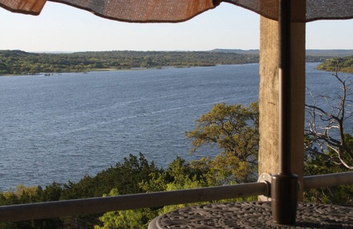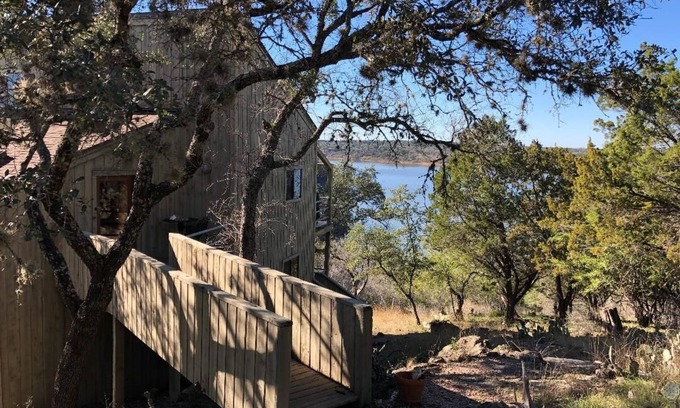 Panoramic Lake Travis Views. Waterfront home in Windermere Oaks in Spicewood, Tx. Total privacy on 5 acres with 2 bedrooms (1 King,1 Queen beds), sleeping bench, and single bed in the hall. 2 baths, 2 decks, 1 covered porch, community tennis courts, community pool, gated community, walking distance to local airport, aviation fuel, aircraft maintenance & aircraft parking, fly in and fly out community.