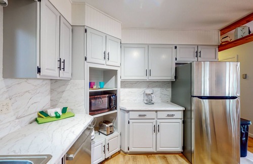 You’ll feel right at home in the sun-filled living area, bursting with charming woodsy decor, cozy seating, and thoughtful finishes. Delight in snuggling up to stream your favorite movies or play board games at the dining table. A well-furnished outdoor living space invites you to have a summer barbecue and kick back on the deck, sharing some local brews and lots of laughs. After gathering for delicious meals created in the full kitchen, wander down to the dock to take an invigorating plunge, embark on a sunset kayaking session, or simply be serenaded by the sound of the waves. As the stars begin to appear, gather everyone around the fire pit to roast marshmallows, swap stories, and create unforgettable vacation memories. Please note that this property does not have A/C.