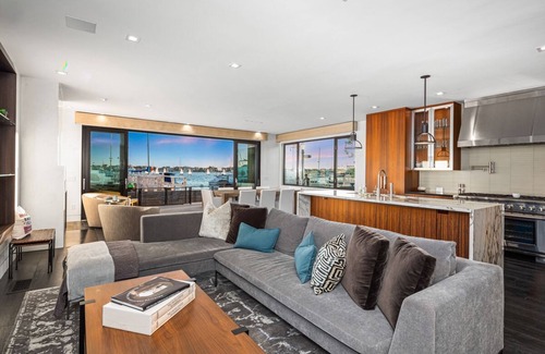 Available for an incredible experience. This fully furnished vacation rental offers it all. Enjoy this trophy location on South Bay Front in the world-famous Newport Harbor! Close proximity to Marine Ave and the ferry crossing. In the middle of all the action, with the best views in Newport! A Duffy electric boat is awaiting you to captain it for cruises with friends and enjoying every nightly painted sunset! With views looking east towards the Harbor entry, and west towards the landmark Balboa Pavilion, a large sunny front patio, a second floor balcony, and third floor roof deck awaits you. The home’s expansive great room beckons through a 17-foot glass wall of Weiland sliding doors leading to living and dining areas with fireplace, high ceilings and a deluxe chef’s kitchen featuring marble counters and eating bar, professional 60 inch Thermador range with double ovens with a SubZero refrigerator. The first level also presents a guest bedroom, full bath, two-car garage, and parking pad for a third car. The second level showcases a luxurious master suite overlooking the Bay with its own balcony, fireplace, and separate breath-taking Bay-view office. The spa quality master bath provides heated floors, his and hers closets, and a spacious multi-head shower room. A second floor guest room can be approached via its own private stairway or the main staircase and features a large sitting and sleeping area and ensuite bath. To complete this amazing home, a third floor roof deck provides a fireplace and seating areas to enjoy all the Harbor has to offer. 1100 South Bayfront was totally remodeled in 2015 with all the luxury amenities including European oak floors with ebony finish, venetian plaster walls and central air. From the moment you step into this home, you can tell it was the masterpiece of an artist.