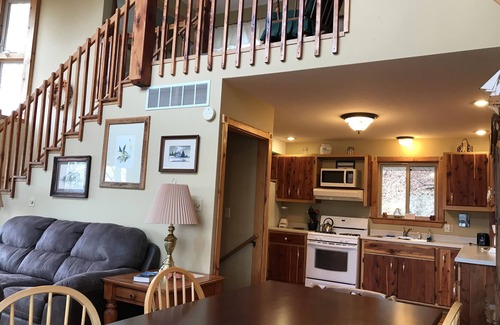 Our “Le Chalet” cabin is 3 stories tall, 2 bedroom, 3 bath, and sleeps 9 comfortably. As you walk in at street level, there is a large bedroom with 2 double beds and full bath. The utility room with washer & dryer complete the first floor. Up the stairs brings you to your 2nd, or main floor. Primarily designed for entertainment, the Main floor contains a LARGE kitchen with plenty of counter space! The dining room table will seat 10 guests. The Living room has a queen sized futon sofa, plus a single sofa, & pull out single sleeper. The TV in the living room has a DVD player, along with a few local channels. A full sized bath is just off the kitchen. Your covered deck out back has a gas grill and large Hot Tub. Your campfire pit, plus wood / charcoal grill are just a few steps away in your back yard, with a great River view! The 3rd floor ‘open’ loft has a queen sized bed and full Bathroom. This is an absolutely ADORABLE cabin! Everything is provided, all you need is food & drink. 2023 PRICES; WEEKDAYS: Monday – Thursday $225.00 per night for the 1st two people. Additional guests are $17.00 each per night. WEEKENDS: Friday – Sunday $235.00 per night for the 1st 2 people. Additional guests are $17.00 each per night. MAJOR HOLIDAYS: $250.00 per night for the 1st two people. Additional guests are $18.00 each per night. THERE IS A 3 NIGHT MINIMUM ON HOLIDAYS. THERE IS A 6 PERSON MINIMUM ON HOLIDAYS.