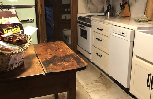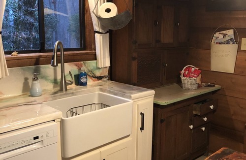 The cabin is equipped with a washer/dryer, sheets, towels, and a starter supply of paper towels, toilet tissue, shampoo, conditioner, bath soap, laundry detergent and dish detergent.