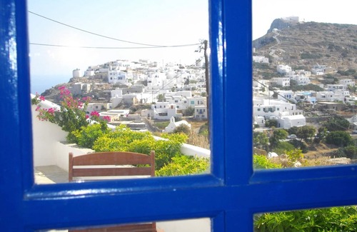 It is located at an extremely nice spot in Sikinos Chorio, with a superb view of the southern, northern and western Kyklades islands. The sunset from the very house is compatible to Santorini's! The house can host easily 7 people (or even more in transported beds, with a small extra cost)