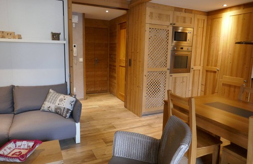 Welcome to Chalet Valsamont! In the center of the village, 100 m from Place du Gros Tilleul, 5 minutes from the skibus shuttle, 2 minutes from shops and restaurants. It is an old house, completely renovated by the owners. The decoration, the furniture, the choice of materials and the equipment are particularly neat. The apartment has a clear view of the Place des Dents Blanches. At the back, a small private garden offers a breathtaking view of the Criou. The apartment on the 1st floor is independent from the rest of the house. A large living room includes a fully equipped kitchen, a dining area for six to eight people, a living area with an ultra comfortable sofa convertible into a double bed (160) foldable (even with the bed made) in the alcove . This room opens onto a balcony (south) overlooking the square. A glass door separates this floor from a duplex bedroom with a double bed (140), a bathroom and a balcony (south-west).