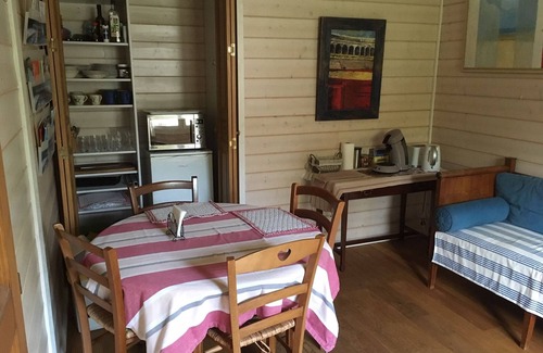 Luxurious house of 75 m2 in large garden enclosed by a gate. 10 minutes from the center of Geneva towards Evian. not shared with other rental customers. Kitchenette with microwave and fridge. Room 1. With large double bed 160 cm and 2 bedrooms with 1 single bed and double sofa bed in the lounge. Bathroom large shower and double sink and toilet. private terrace overlooking the garden. Breakfast provided in the morning at the door.