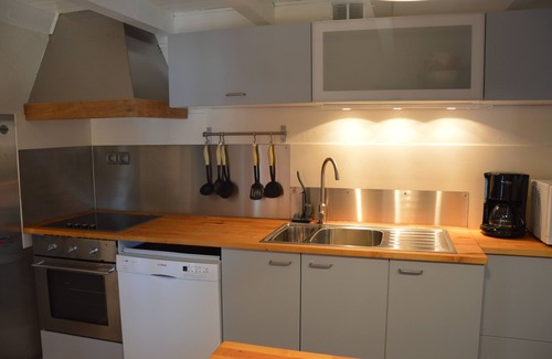 On the ground floor, equipped kitchen (dishwasher, washing machine, oven, microwave, fridge) overlooking an enclosed patio dining area overlooking the outside. 1 dining room with a small lounge area (wood stove). 1 bedroom with 1 bed 140, 1 bathroom (shower, washbasin), 1 WC.