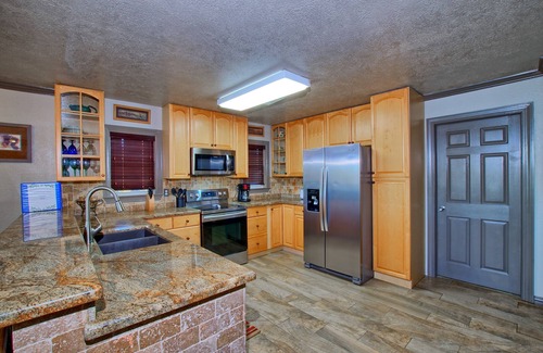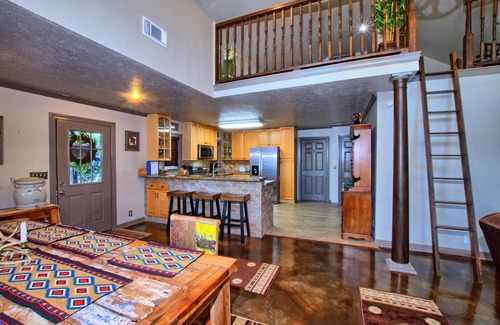 This family-friendly, pet friendly home has beds to accommodate up to 10 people. There are two bedrooms with king-size beds, a bonus room with a queen-size bed, and a full-size bed plus a loft with a full-size bed. The loft is accessed with a ladder, which is perfect for older children. All linens are provided.