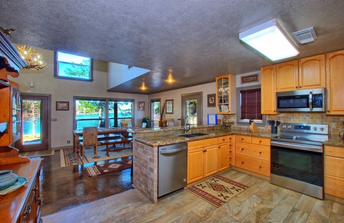 With an open floor plan, the living room, dining room, and kitchen all have great views of the lake.