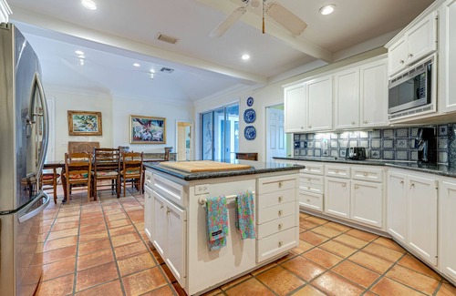 When you enter this fabulous home, you will discover a colorful living area furnished with comfortable sofas and chairs throughout, creating a fantastic spot to wind down, chat, and plan all of your next adventures. A cozy family room can be found nearby, offering a welcoming place to enjoy a fun TV show or read a favorite book. Prepare delicious treats and meals in the spacious eat-in kitchen, which has been appointed with all the essentials to whip up anything that comes to mind. Find stainless steel appliances, three coffee makers, a convection oven, and a dishwasher. You can dine here or in the formal dining room. Laundry will be a breeze thanks to the washer/dryer on-site. The home offers a sunny back patio facing the water with plenty of comfy seating, including lounges where you can unwind and work on your tan as you take in the views. Three bedrooms can be found on the main level, including two primary suites, and a fourth bedroom can be located upstairs.
