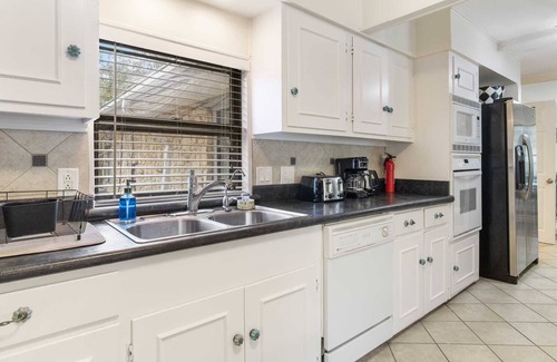 The brand-new interior at Indian Springs is kept comfortable with a combo of central air, mini-AC and heat units, and ceiling fans. The spacious living area features two Roku-ready smart TVs and Wifi for entertainment. There's a dining area with both bar-style and table seating, and the full kitchen is equipped with modern appliances, cooking, and serving ware, utensils, and glasses. You'll also have a convenient laundry room!