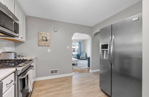 HOUSE: You will have keyless entry to the house. The code will be provided to you on the day of your arrival. Our house is fully equipped with three luxurious beds, (3) smart, Roku TV's (living room and both bedrooms), keyless entry, WI-FI (Business High-Speed) Internet, office set-up (wireless printer, shredder, desk, chair) one futon, dining table, family games, cornhole games, books, air conditioning/heating, bathroom towels, (4) beach towels, hair dryer, washer/dryer (laundry soap available), central air/heat, 10x10 tent, beach chairs, (4) fishing poles and tackle box, large outdoor sitting area with fire pit, propane grill and off-street parking. Also included is an entry pass to our Indiana Dunes State Park/Lake Michigan beachfront. KITCHEN AMENITIES: Our fully stocked and newly renovated kitchen is equipped with stainless steel appliances, toaster, coffee maker, coffee, sugar, creamer and filters, gas stove, refrigerator, microwave, utensils, pots/pans, cooking kettle, Brita water purifier, water bottles, purex bowls and baking dishes, dish service for 8, drinking, beer and wine glasses, cookie sheets, cupcake pans, measuring cup, cutting board, lighter, kitchen towels, plastic wrap, aluminum foil, and much more.