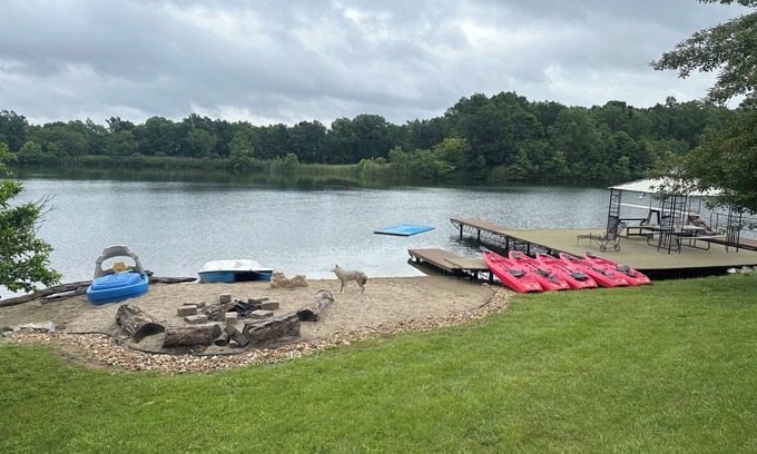 Imagine, peaceful serenity as you float around in your kayak! And then, when you are ready, take out the big pontoon boat and challenge your fishing skills. 2 outdoor firepits with a small sandy beach. 2 docks with a 14 foot diving board and covered accomidations. Side-by-sides are allowed on the property, but must remain on the gravel.