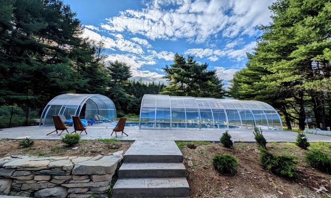 Welcome to Heart Stone Manor! Indoor, heated pool slides open in the summer to become an outdoor pool. Swim 365 days. 6 person hot tub. Huge, brand new, designer home meticulously curated to feel upscale yet relaxed. The kitchen will leave you speechless with its 13' island, 8 burner range, 3 ovens, 2 sinks, quartzite stone countertops. 2 primary suites. 7 bedrooms, 5.5 baths, game room, 50' long covered porch, 18x15 deck, 8 acres, firepit, grill, badminton net. 90 miles from GW Bridge.