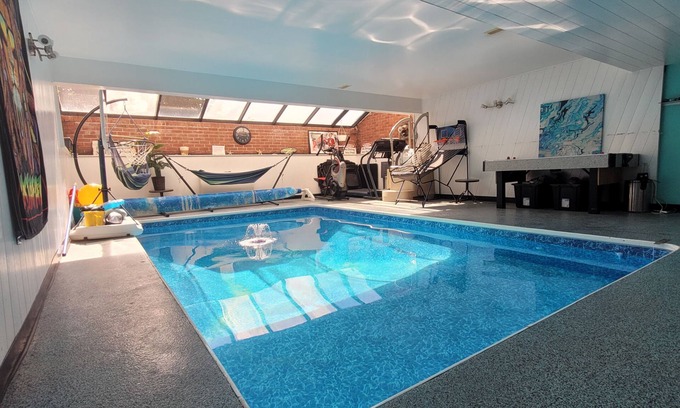 Make some memories in our quaint town and stay at our unique family-friendly home with a private indoor heated salt water pool & hottub in the basement. The pool room has a TV, air hockey table, Foosball and basketball game. The fourth bedroom doubles as a board and Video games room/gym and there is a hockey training center on the garage. The fenced backyard has a deck, propane BBQ and seating area, movie screen & projector, trampoline and fire pit (firewood provided). Fun for the whole family!
