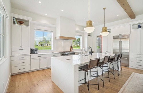 This spacious retreat features luxuriuos living areas with high ceilings, floor-to-ceiling windows and en-suite bedrooms with plush bedding and fine linens. Enjoy the convenience of a fully equipped gourmet kitchen, home entertainment throughout the home, a studio gym, and high-speed Wi-Fi. Outside includes two porches, two terraces, a pool house with a full bathroom, an outdoor gas grill and plenty of space to relax around the beautiful pool and generous sized spa.