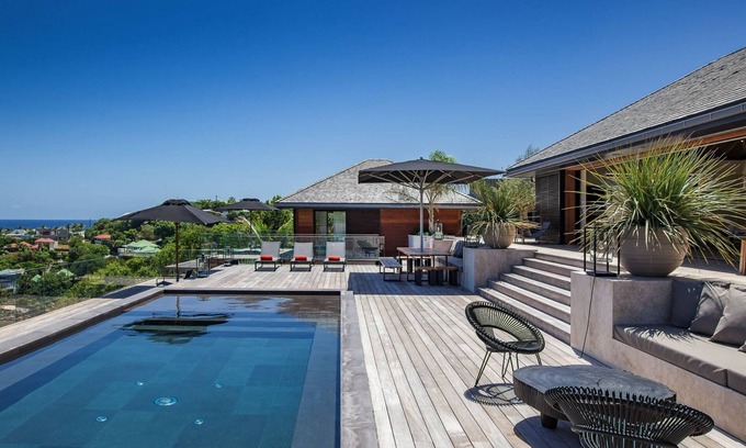 Few minutes drive away from orients bay and the wildcats of toiny stands on the hill of Marigot the 6 bedroom luxury villa rental Blackstone, thatoffers a magnificent panoramic view on MARIGOT’s bay, protected area by the ST BARTH Marine Reserve. It’s a beautiful private gated property that includes a large wide open terrace and living-kitchen, a wheelchair accessible bedroom on one side, and a separated bedroom with private terrace on the other side.A staircase leads to the lower level, where are located the 4 remaining bedrooms, with the possibility for 2 to connect, along with a fitness room. The villa offers many great comfortable and high-quality spaces for leisure and all the rooms benefit from ocean view. BLACKSTONE villa rental is a must for large friend groups or family in ST BARTS.