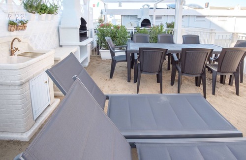 The apartment on the first floor, in an elegant and exclusive context totally renovated, inside a fenced court. It overlooks the beach and the main square of the village. It consists of 2 double bedrooms, one with a bunk bed, a kitchen with a double sofa bed, 2 private bathrooms with shower. It has a sand garden, for exclusive use, with pergola, table and chairs, sun loungers and barbeque, to organize outdoor barbecues with new and old friends. It is tastefully furnished according to the latest trends in furniture. The kitchen, in perfect industrial style, is equipped with all the most modern appliances (induction hob, dishwasher, washing machine, microwave, etc ....).