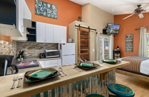 INDOOR LIVING: Smart TV with complimentary Netflix streaming, bar top with seating for 3, ceiling fan, blackout shades, Tempur-Pedic queen bed