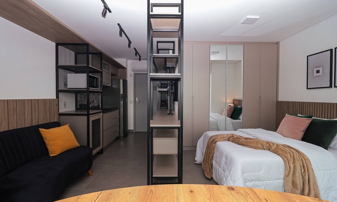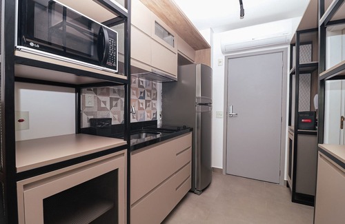 The space was designed with many drawers and shelves to organize and store personal items in the best way, with a spacious 6-door closet and a mirror next to the bed to help give the room more space. In addition to a full kitchen with refrigerator, induction hob, microwave. The studio also has a television in front of the double bed, a recently renovated bathroom with a marble sink following the style and colors of the apartment, everything for you to stay cozy and relax in one of the most chic neighborhoods in the city of São Paulo.