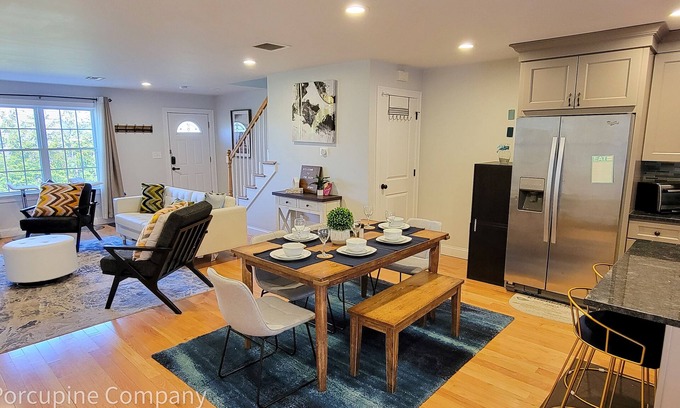 The open concept home is artistic and family-friendly. This wonderfully spacious 5-bedroom townhouse is an airy, modern 3-story home with a bonus loft which includes a ping-pong table. This open concept home has notes of art carefully sprinkled throughout with a minimalistic charm. It's fresh, artistic and beautifully designed for your travel accommodation. This family-friendly property has a full yard, garage, and a full kitchen with appliances. The first floor includes a half bathroom, a corner nook with a bed, a workstation, and large windows overlooking the lawn. A great opportunity to let the afternoon sun in! The second floor includes 4 additional bedrooms: the Master, with an en suite bathroom, a kids' room with two twin beds, and two other guest rooms. One room leads to a loft on the 3rd floor. This short-term property has lovely polished hardwood floors, central heating, and air conditioning, a smart security system, YALE keyless entry, and Nest thermostats, and stacked cupboards to make you feel more at home. Guests can enjoy access to a gorgeous fenced-in backyard with a well-maintained lawn for outdoor enjoyment. This home also includes a cozy living room for relaxing and movie nights. We equipped all Smart TVs with premium channels. There are spaces to work and play. The Glen is just a hop and a skip from restaurants in Downtown Framingham and is between both West Natick and Framingham T commuter rail stops for those Boston trips during your stay. We can't wait to welcome you to your getaway at The Glen!