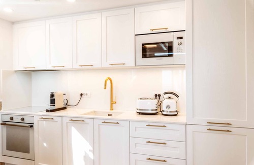 Enter the stunning and spacious living area with a feature fireplace and wall-mounted 4K 50"Smart TV with a sound bar. Tiled floors guide your way through each room, giving an added touch of elegance. The kitchen is a chef's dream, equipped with all the essentials for a hearty home-cooked meal with a small table for quick breakfasts or cups of coffee. Also on this floor,an ensuite double room benefits from air conditioning, a flat-screen TV, and access to the patio. Moving upstairs, you’ll discover the main bedroom designed in a minimal style to form an idyllic rest space.