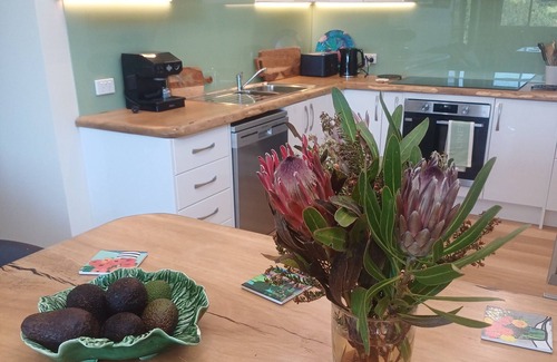 Infinity Cottage's living area includes a fully equipped kitchen, breakfast bar, dining table, smart TV. games and books. The beds are comfortable and bathrooms new and freshly renovated. The verandah, with dining table for 12 people, provides a great additional outdoor living space.
