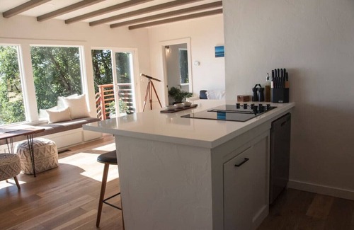 The Wind and Tide has one full bathroom with plush towels and a washer and dryer available for your use at any time during your stay. The kitchen is fully equipped with a new glass stove-top, dishwasher, and fridge; it’s stocked with all the cooking utensils and kitchen tools you’ll need. Complimentary coffee and tea are provided for you, with a drip coffee machine and a French press, too. The dining room seats six and features a lovely old growth redwood table restored from the original home.