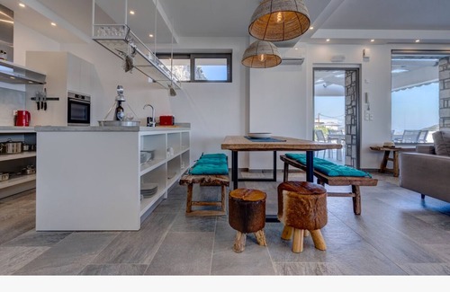 *Open space Kitchen & Living room with couch and kitchen dining table for 8 people.