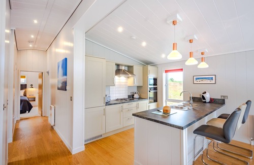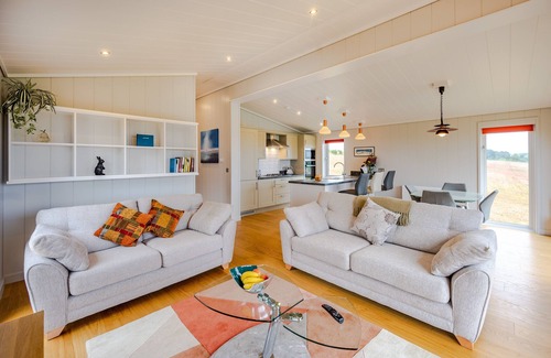 Constructed in 2020 and being one of three Brickley Wood Lodges (neighbouring Avocet Lodge and Ingol Lodge) set high on the hill above the small village of Ingoldisthorpe. With beautiful boutique-style interiors and high end fixtures and fittings, you really will want for nothing - every little detail has been thought of to ensure you have the finest holiday. Just shake off your shoes, and slip into the slippers and dressing gowns provided, turn on the coffee machine, take a seat, relax and unwind in peaceful surroundings and simply take in the landscape above and below. The spacious light-filled, open-plan living area at the front of the lodge has a smart fitted kitchen at the back of the room that overlooks the dining and sitting areas where there's a widescreen television to entertain, should you ever tire of the endless view. From here double french doors lead out to an outdoor deck - this part of the North Norfolk coast unusually faces West and is the ideal place to watch as the sun sets on the Wash in its glorious technicolour. At the rear of the lodge are two supremely comfortable bedrooms, both with super-king size beds; one of which can be offered as full-size twin beds if preferred, and two bathrooms, one being en-suite to the master bedroom. An app operated electric charging point is available on site, which is a shared facility with the neighbouring lodge.