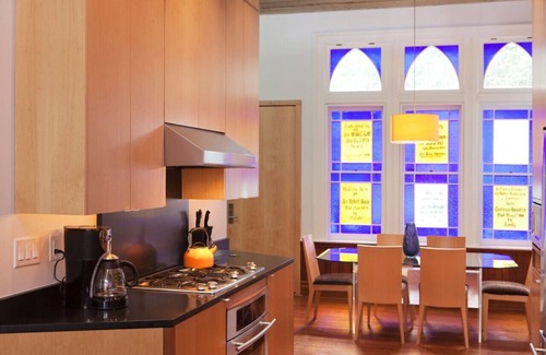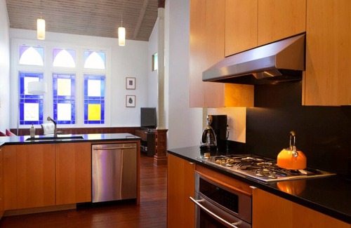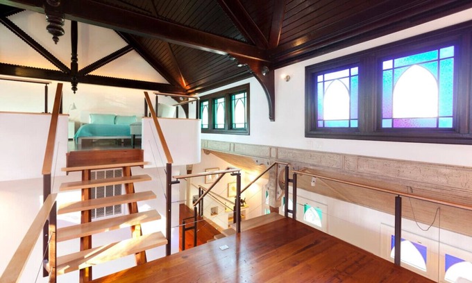 Built in 1889 as St Paul's Episcopal Church by architect Eric Eichberg, this historic property hosted varied congregations over the past century before falling into disrepair around 2002. Restoration began in 2005 and the MIddle Loft was completed along with the exterior in 2008. The exterior sides, covered with stucco, were refitted with cyprus siding. The original vintage pine was reclaimed from the roof and sides to be used for the interior construction. The flying buttresses and bell-tower, both missing for decades, were reconstructed from historic photographs. About 50% of the stained glass was replaced with restoration glass, the surviving memorials were restored where possible.