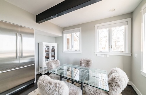 The dining table is steps from the kitchen and features a 20-foot Restoration Hardware table that is stunning. Comfortably seats up to 12 people.