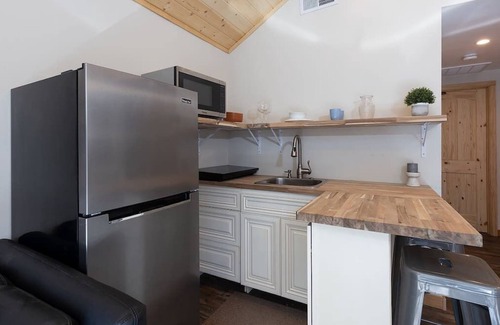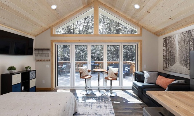 The space has flexibility for whatever you desire most in terms of experience. Feel like outdoor living? Then open the glass doors completely and immerse yourself in nature. Feel like doing a Zoom call for work? Then close the glass doors, let everyone else play on the deck open your laptop, and focus on work for an hour. The cathedral ceilings and large windows create lots of light and space. The ceiling fan keeps the air going for a comfortable time inside. The kitchenette with an induction cooktop is a great way to cook your own meal without heating up the entire space. Or, you can do traditional BBQ on the grill and enjoy the solitude of the trees.