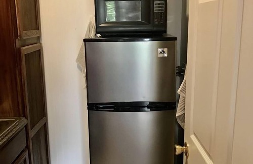 *Microwave, toaster, coffee maker, mini refrigerator, dishes, cups, bowls, pans, and utensils.