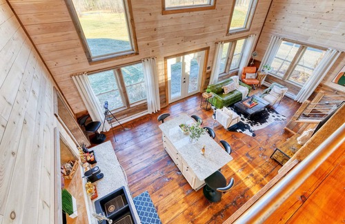 Welcome to our cozy yet spacious Poconos cabin, where rustic charm meets modern comfort. With 20' vaulted ceilings and warm wood interiors, this 2-bedroom, 2-bath retreat sleeps up to 8 guests. The lofted king master ensuite offers privacy while overlooking the open-concept living space below, and a second king bedroom on the main floor shares access to a full bath.