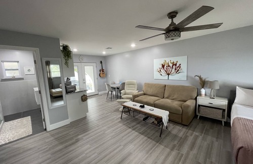 Romantic suite sectioned off from the main home as a guest suite. The guest suite has a private bath and private entrance. You will enter into the "living room, "that has desk/eating area, a smart TV a couch, plus a walk-in closet. Enjoy your morning coffee at the court yard 🌴 just across your entryway, fish right off our dock, view dolphins 🐬 swim by and watch magnificent sunrise 🌅 and sunset
