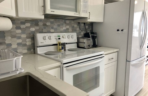Now welcoming all guests! Enhanced cleaning protocols implemented. The beach is open and beautiful! This is the perfect spot to de-stress and relax! This condo is gorgeous with ocean view over looking the heated pool! Full size equipped kitchen, comfy queen bed, 43” Smart/HDTV/basic cable and WiFi. Google home for music.