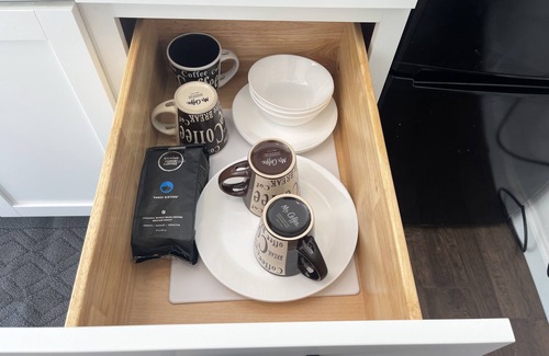 This 1 bedroom guesthouse is the perfect lodging for a quiet and efficient Dallas trip, equipped with all the essentials while keeping you comfortable. The beautifully lit kitchen is furnished with brand new quartz countertops, electric tabletop stove, and all the coffee, tea and snacks to jumpstart your morning.
