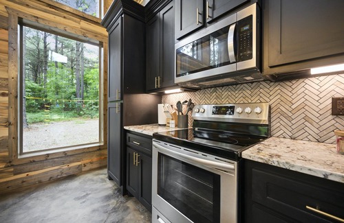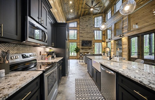 Our modern, single-story cabin features soaring ceilings and walls of windows to take in the surrounding nature. The cabin has an open concept floor plan with a living room, kitchen and dining area that opens up onto a large covered outdoor deck. There is an indoor fireplace that is operational seasonally.