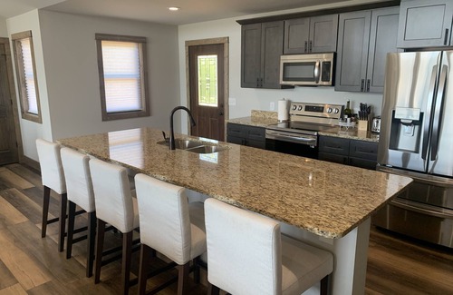 Our main floor has an open floor plan and western views of Beach Lake. A fully equipped kitchen with island seating for 5. Sizable pantry for storage. Refrigerator/freezer, electric oven/stove, dishwasher and microwave.