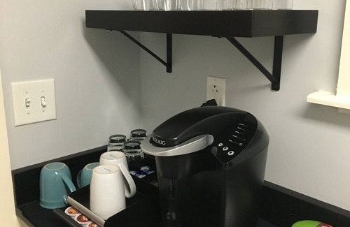 -eat in kitchenette equipped with full sized refrigerator, microwave, sink, kuerig coffee maker and table