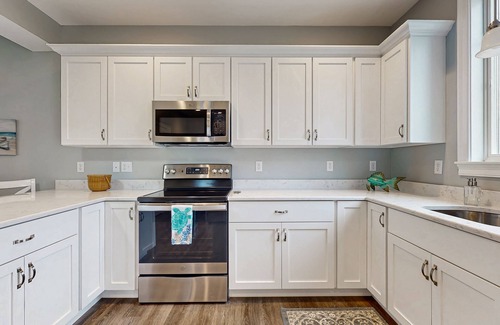 The cottage is beautifully decorated with beach-themed decor, creating a pleasant and restful vacation atmosphere. Both bedrooms feature premium plush king-size beds, large closets, and access to their own full baths—one with a walk-in shower and the other with a tub/shower combination.