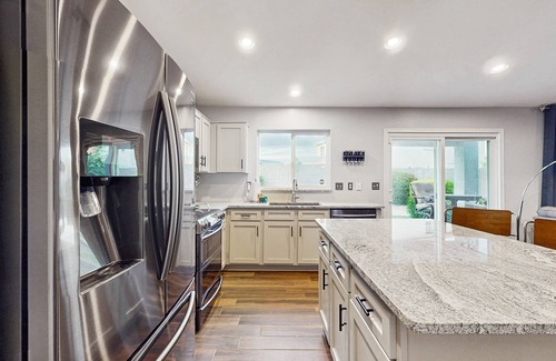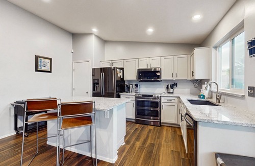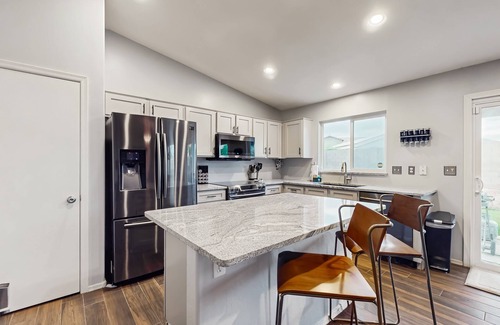 This darling home enjoys a private enclosed backyard with a beautiful lawn and a covered patio with a small yet convenient outdoor dining area. You can hear the birds chirping in the backyard while dining alfresco! As you enter this air-conditioned retreat, you will find an airy open floor plan that seamlessly combines the living room, dining area, and kitchen. The living area offers a great spot to unwind and relax with your loved ones - stream your favorite series and movies on the smart TV, and plan your next adventures while munching delicious homemade snacks. An open kitchen with modern appliances will surely help you prepare the most delicious homemade treats and meals for the group. The home also boasts a working office with a spacious desk, monitor, and printer should you need to work remotely during your stay. The primary bedroom enjoys a TV, an electric fireplace, and an en suite bathroom.