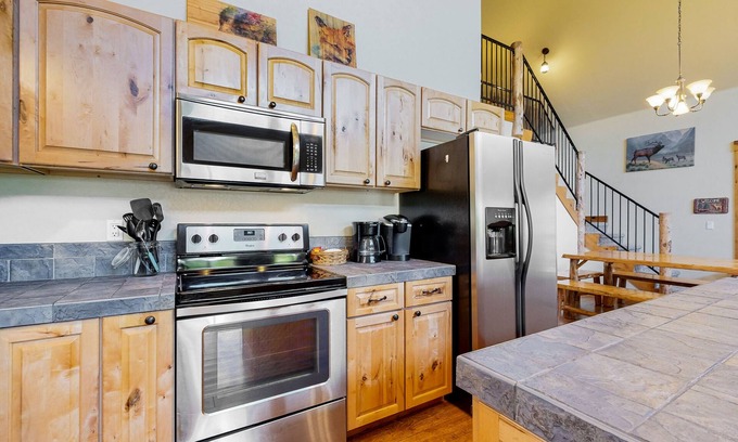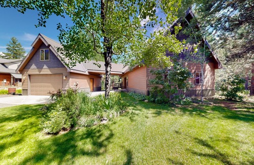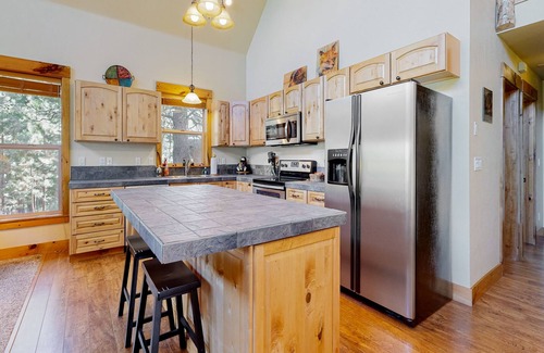 Contemporary cabin stylings and a convenient location close to year-round recreation and attractions make this the perfect home base for a relaxing getaway. Serene treetop views abound from the covered balcony, and a gas grill is included for family barbecues. A plush sofa chair and leather recliners provide plenty of comfort in the living area and a smart TV is equipped for casual home entertainment. The stainless steel kitchen comes ready for home cooking. The home is only four miles from downtown bars, shops, restaurants, and the lakefront Legacy Park. McCall Golf Club and Ponderosa State Park are each within a five-mile radius.