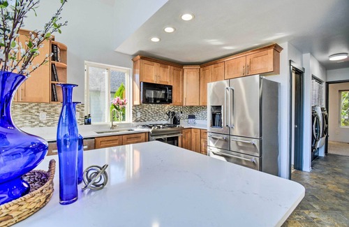 KITCHEN: Cooking basics, stainless steel appliances, large kitchen island for dining, spices, dishware & flatware, Keruig coffee maker, tea kettle, toaster, dishwasher, microwave, Ninja blender, instapot pressure/slow cooker